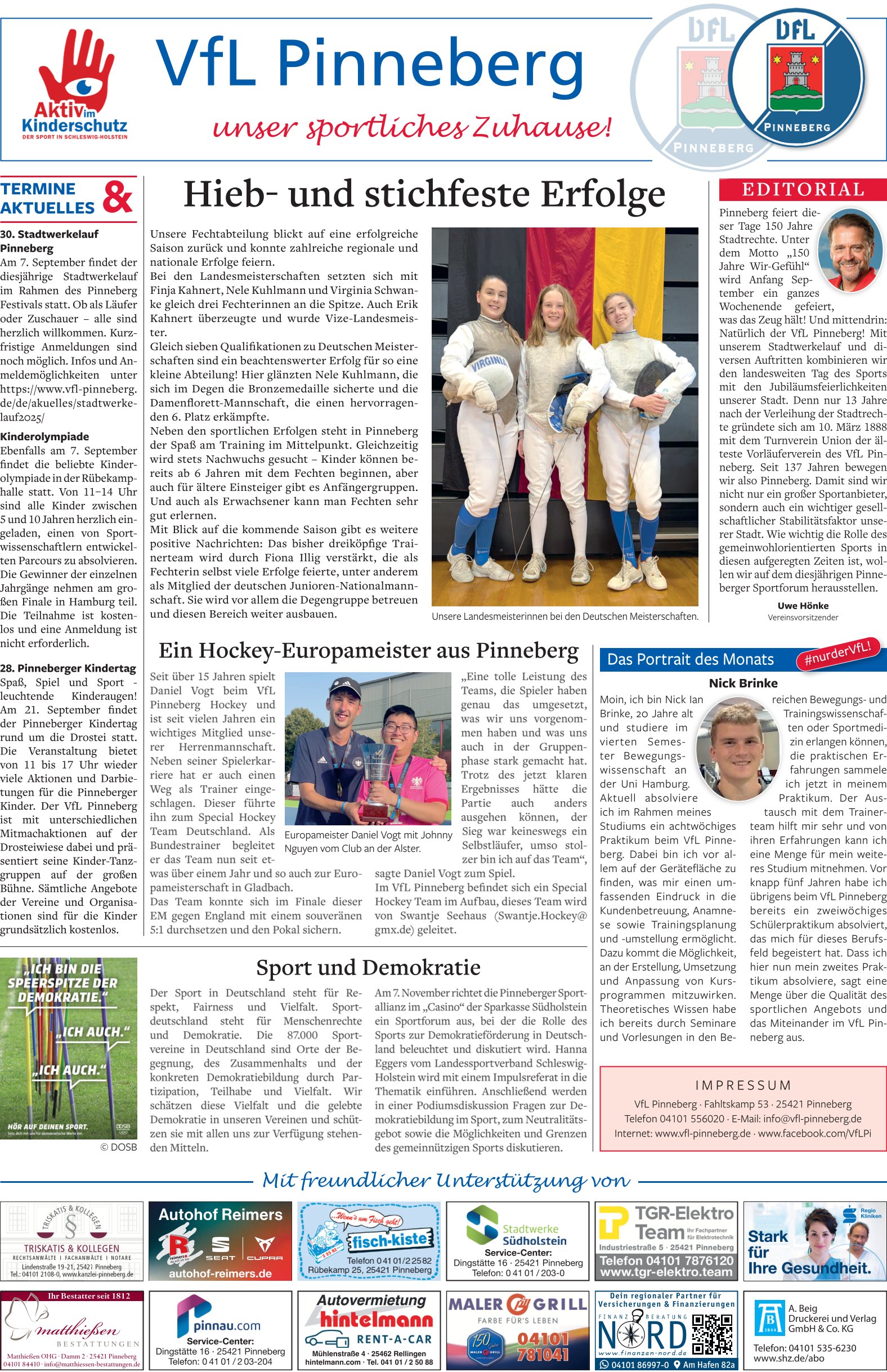 Der VfL Pinneberg bringt monatlich eine Sonderseite als Beilage im Pinneberger Tageblatt und und im Tip am Sonntag heraus. Es gibt Neuigkeiten aus den verschiedenen Abteilungen. Weiter informiert die Geschäftsstelle über Änderungen, Wissenswertes und vieles mehr. Hier können Sie die Sonderseite herunterladen.
