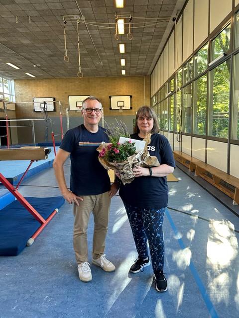 Zu ihrem Dienstjubiläum hat sie Erik Krebs, Vorsitzender der FTG und Mitglied des erweiterten Vereinsvorstandes, mit einem Blumenstrauß und einem Präsent überrascht.
