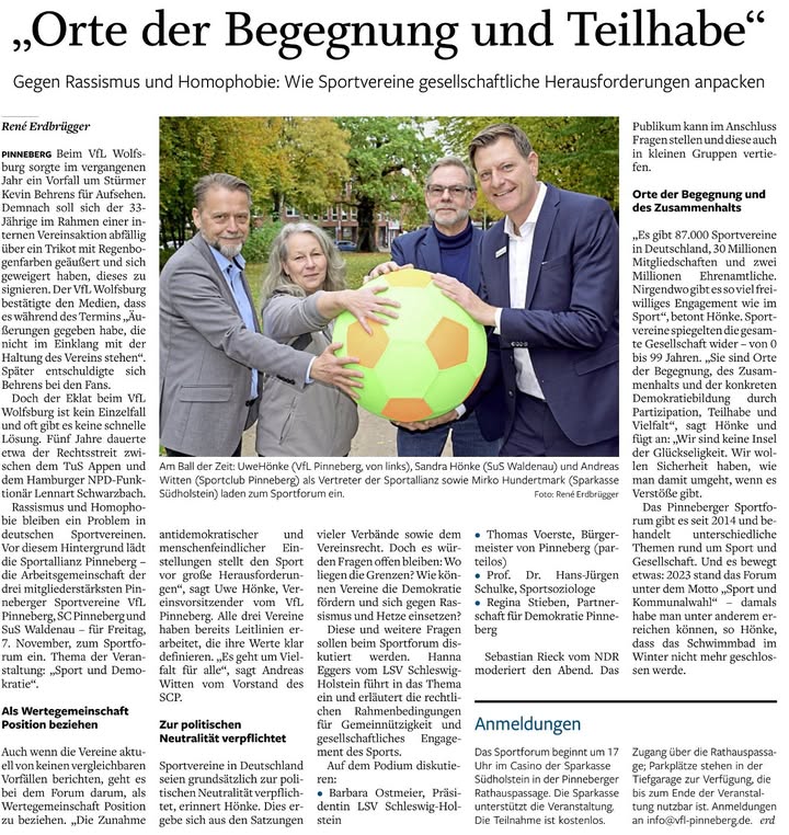 Heute ist im Pinneberger Tageblatt ein Vorbericht zum Sportforum "Sport & Demokratie" am Freitag, 7. November, um 17 Uhr in der Sparkasse Südholstein (Rathauspassage) erschienen.