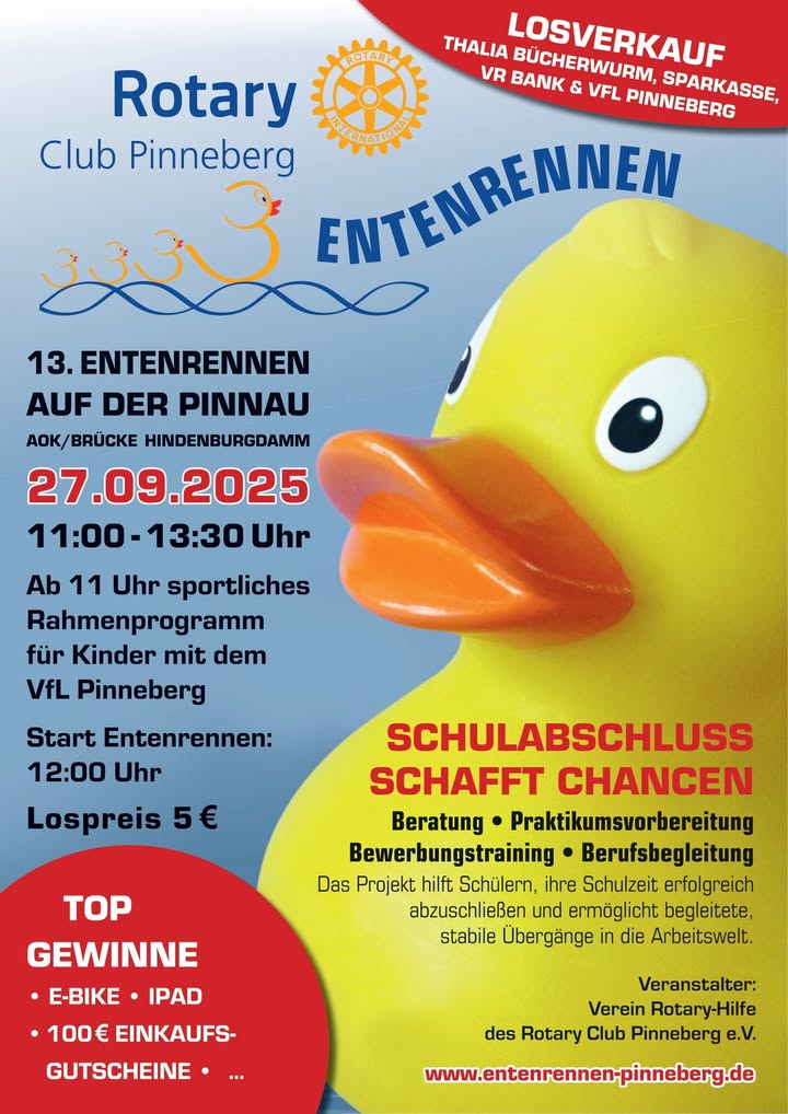Ab sofort könnt Ihr für Euch selbst und Eure Liebsten Lose für das Entenrennen bei uns im Sportzentrum erwerben. Für 5,00 € pro Stück unterstützt Ihr das Projekt "Schulabschluss schafft Chancen". Und es ist das 13. Entenrennen - das schreit nach GLÜCK!