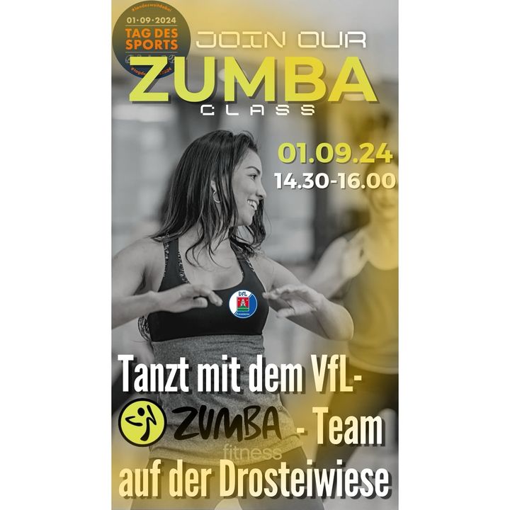 Tanzt alle mit uns beim Tag des Sports auf der Drosteiwiese! Die Teilnahme ist kostenlos. Bringt Eure Freunde mit und lasst uns gemeinsam eine tolle ZUMBA-SOMMER-Party genießen!