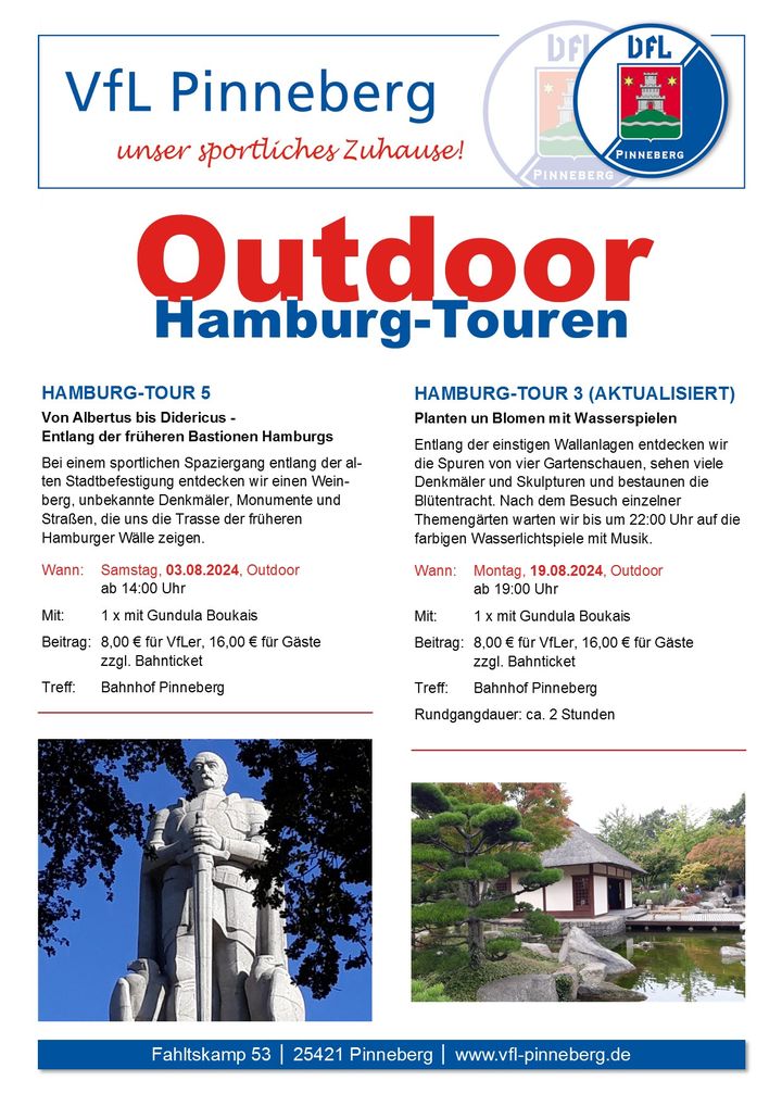 Wir starten ab August mit unseren neuen Hamburg-Touren! Melde dich jetzt zu einer der spannenden und informativen Touren mit unserer Hamburg-Expertin Gundula Boukais an. https://www.vfl-pinneberg.de/de/sportarten-a-z/Kurse/