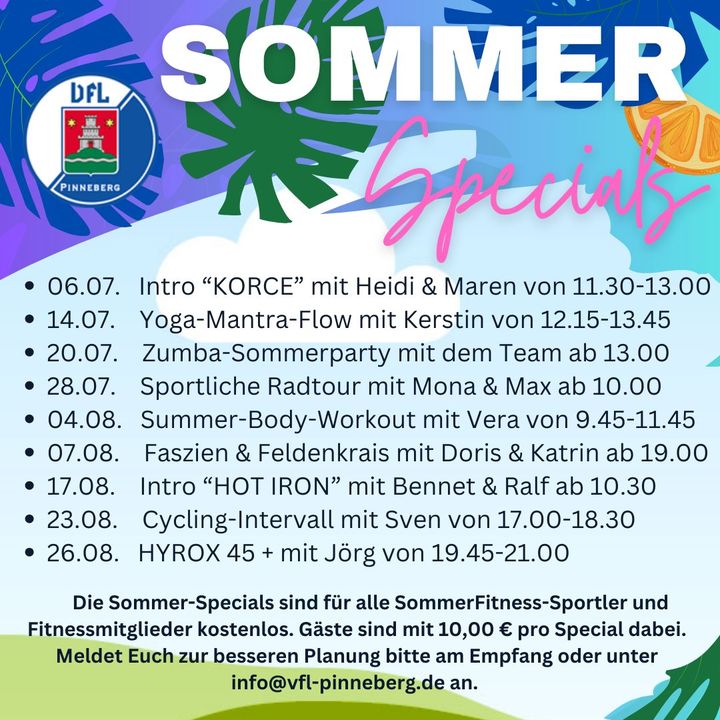Es ist wieder soweit! Im Juli & August führt das vereinseigene Fitness-Studio die SommerFitness durch. Nichtmitglieder und VfLer können alle Fitness-Kurse und das Training auf der Gerätefläche kennenlernen. Der Deal lautet: zahle 55,00 € (VfLer 20,00 €) und trainiere flexible v...