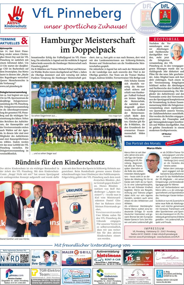 Ministerpräsident Daniel Günther hat den VfL Pinneberg für sein Engagement im Kinderschutz mit einer Urkunde gewürdigt und im Portrait des Monats stellen wir mit Marco Klein den neuen Abteilungsvorsitzenden unserer Karateabteilung vor.