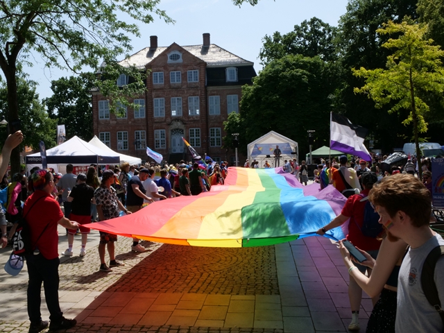 Zusammen mit vielen anderen haben wir dann die Parade mit der riesigen Regenbogenflagge begleitet! 🏳️🌈