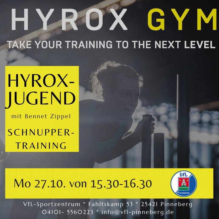 Alle 15-17 Jährigen können bei diesem Schnuppertraining von 15:30-16:30 Uhr das HYROX-Konzept kennenlernen: HYROX ist ein innovativer, einzigartiger & ganzheitlicher Fitness-Ansatz, der Laufen und funktionelle Fitness zum größten Indoor-Sportevent der Welt vereint.