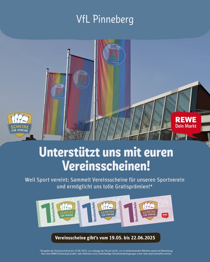 Am 19.05.2025 startet wieder die Aktion Scheine für Vereine von REWE. Unter dem Motto "Sport vereint" können wieder Vereinsscheine gesammelt und für den VfL Pinneberg eingelöst werden.