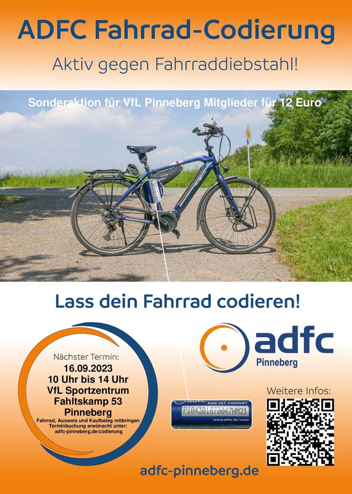 Am Samstag, 16.09.2023 von 10:00-14:00 Uhr, findet am VfL-Sportzentrum eine Fahrrad-Codierung vom ADFC statt.