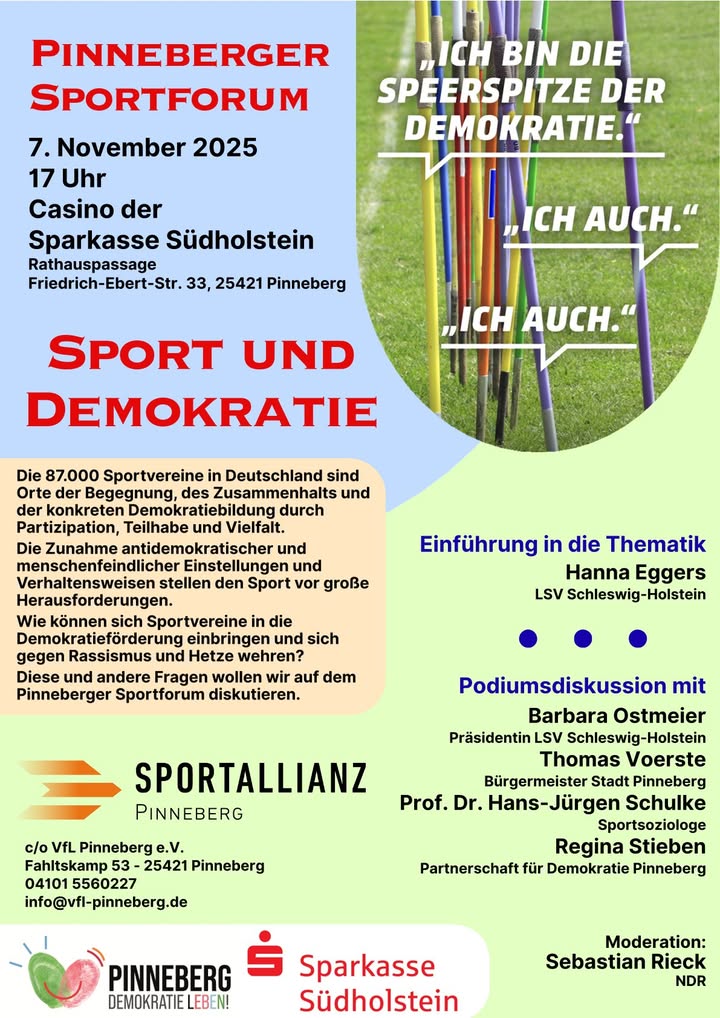 Die Sportallianz Pinneberg lädt am 7. November 2025 zum Sportforum "Sport & Demokratie" ein. Das Forum beginnt um 17 Uhr im "Casino" der Sparkasse Südholstein in der Pinneberger Rathauspassage.