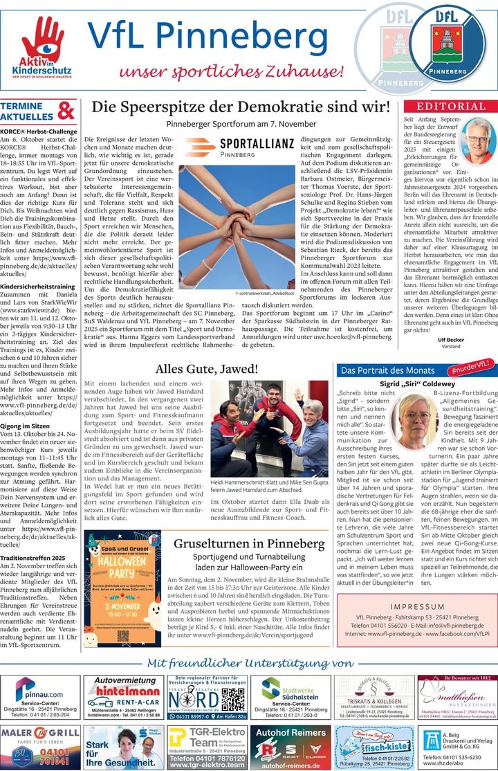 Auf unserer aktuellen VfL-Sonderseite, Ausgabe 10/25, schauen wir auf das nächste Sportforum der Sportallianz Pinneberg am 07.11.2025 mit dem Thema "Sport & Demokratie".
