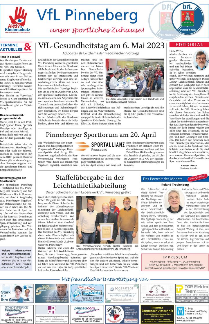 In unserer aktuellen Ausgabe der monatlichen Sonderseite im Pinneberger Tageblatt und dem Tip – Tageblatt am Wochenende blicken wir nach vorne auf zwei bemerkenswerte Veranstaltungen. Am 20 April richten wir im Verbund der Sportallianz Pinneberg wieder ein Sportforum aus und werden den Pinneberger Politiker:innen vor der Kommunalwahl kritische Fragen stellen. Und am 6. Mai können wir endlich wieder unseren bewährten VfL-Gesundheitstag mit Vorträgen zum Thema „Adipositas“ und einer abwechslungsreichen Messe durchführen. Mit Roland Troelenberg stellen wir den neuen Vorsitzenden unserer Leichtathletikabteilung vor. Er folgt auf die VfL-Legende Dieter Scheithe, den wir auf der Jahreshauptversammlung seiner Abteilung zum Abschied mit dem „Lebenswerk VfL Pinneberg“ geehrt haben.