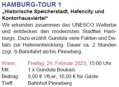 Sei dabei! Melde dich jetzt noch an zur spannenden und informativen Hamburg-Tour mit Gundula am 24.02.2023. https://www.vfl-pinneberg.de/de/sportarten-a-z/Kurse/