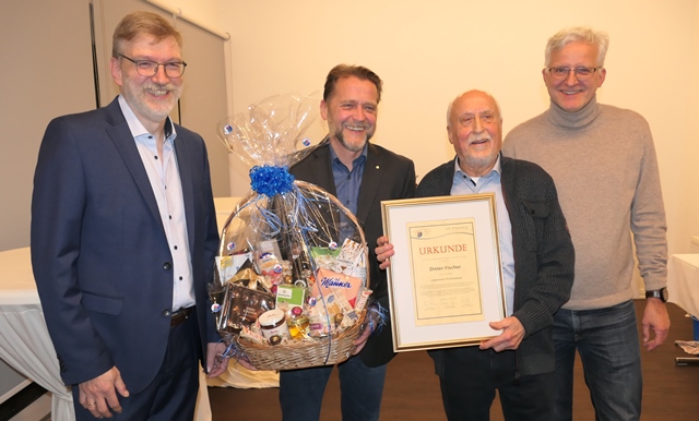 Am Donnerstag, dem 12. Januar 2023, gab er seine letzte reguläre Lungensportstunde, einen Tag später wurde Dieter Fischer dann mit großem Bahnhof vom Verein verabschiedet. Gut 40 Jahre war der gebürtiger Berliner im VfL Pinneberg tätig. Langjährige Wegbegleiter, Freunde und Familie nahmen an dem kleinen Empfang im VfL-Sportzentrum teil. Vereinsvorsitzender Carsten Lienau würdigte in seiner Begrüßung das Wirken und die Verdienste Fischers und ging auch auf sein Engagements außerhalb des VfL Pinneberg ein. Er gründete die erste Asthmasportgruppe in Schleswig-Holstein, baute den Gesundheits- und Rehasport im VfL Pinneberg auf und initiierte den VfL-Gesundheitstag mit medizinischen Vorträgen und Messe. Und er stand 28 Jahre der FTG im VfL Pinneberg als Abteilungsvorsitzender vor. Bereits 2004 wurde er für seine Verdienste um den Verein zum Ehrenmitglied ernannt. 2012 folgte der Eintrag in das Bürgerbuch des Kreises Pinneberg und 2014 erhielt Dieter Fischer das Bundesverdienstkreuz. Bürgermeisterin Urte Steinberg, Sönke-Peter Hansen und Andy Schmidt von der Sparkasse Südholstein unterstrichen das Wirken von Dieter Fischer noch einmal in ihren Grußworten und hoben seine Herzlichkeit und positives Denken hervor. Zum Abschluss des Empfangs überraschte der Vereinsvorstand Dieter Fischer noch mit einer besonderen Ehrung und überreichte dem 80jährigen eine Urkunde für sein „Lebenswerk VfL Pinneberg“, das nur für langjährige und außergewöhnliche Verdienste verliehen wird. „Der gemeinwohlorientierte Sport braucht Menschen wie dich, lieber Dieter. Menschen, die sich für andere einsetzen, Inhalte voranbringen und sich beharrlich für die Werte des Sports einsetzen“ sagte Carsten Lienau.