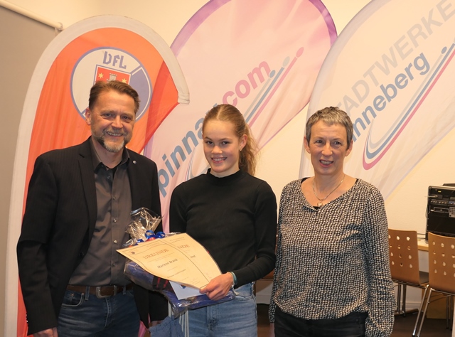 Aufgrund ihrer herausragenden sportlichen Leistungen wurde Marlene Brand nun zum Talent des Jahres des VfL Pinneberg gekürt. Dieser Titel wird seit 2017 vom Verein in Kooperation mit den Stadtwerken Pinneberg und der pinnau.com an besonders talentierte junge Menschen verliehen. Nachdem im vergangenen mit Ben Schulze ein Nachwuchsschiedsrichter geehrt wurde, stehen in diesem Jahr wieder die sportlichen Leistungen im Vordergrund. Martina Wollgarten von den Stadtwerken Pinneberg und Uwe Hönke nahmen die Ehrung im Rahmen einer kleinen Feierstunde vor. Vom VfL Pinneberg wurde Marlene Brand zudem die Bronzene Verdienstnadel verliehen, die für besondere sportliche Leistungen vergeben wird.