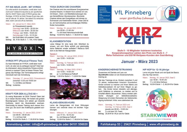 Gemeinsam und motiviert ins neue Jahr! Egal ob sportlich, gesellig oder informativ – der VfL präsentiert ein umfassendes Kurzzeitprogramm für das 1. Quartal 2023 und bietet hiermit vielen Interessierten die besten Möglichkeiten, die guten Vorsätze umzusetzen. Suche dir das passende Angebot aus und melde dich an unter www.vfl-pinneberg.de oder Tel.: 04101 / 556020.