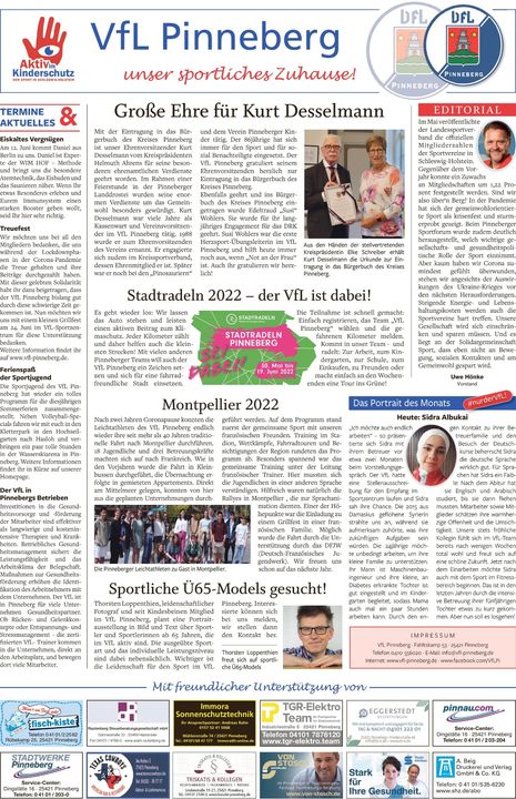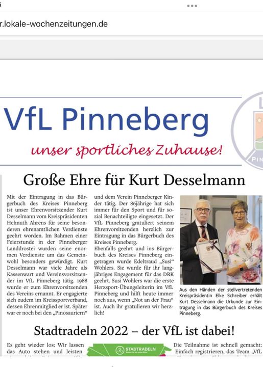 Unsere monatliche Sonderseite ist wieder da. Im Juni berichten wir über die Ehrung von Kurt Desselmann. Unser Ehrenvorsitzender wurde ins das Bürgerbuch des Kreises Pinneberg eingetragen - wir gratulieren herzlich und freuen mit ihm.