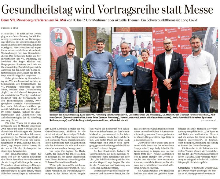 Am kommenden Samstag wird es im Sportzentrum des VfL Pinneberg einen "Gesundheitstag light" geben. Auf eine große Messe mit Tests, Aktionen, Beratung und Mitmachständen wird in diesem aufgrund der pandemischen Lage verzichtet. Dafür haben wir großartige Vorträge zusammengestellt. Es wird um die Krankheitsbilder Diabetes, PAVK (Schaufensterkrankheit), Schilddrüse und Long Covid gehen. Die Vorträge beginnen um 10.15 Uhr und enden ca. 13 Uhr.