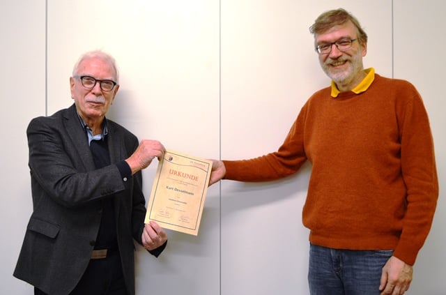 Der Vereinsvorsitzende Carsten Lienau überreichte dem Ehrenvorsitzenden dafür eine Urkunde und die Goldene Ehrennadel für seine 50jährige Vereinsmitgliedschaft.