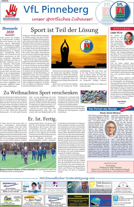 Die Dezember-News des VfL Pinneberg sind da. Da es ja leider aus dem aktiven Sportleben derzeit nicht so viel zu berichten gibt, haben wir uns auf andere Schwerpunkte konzentriert. Im Leitartikel geht es z.B. darum, dass Sport in Zeiten der Pandemie ein Teil der Lösung und nicht des Problems ist. Jetzt auf Sport zu verzichten ist der falsche Weg!