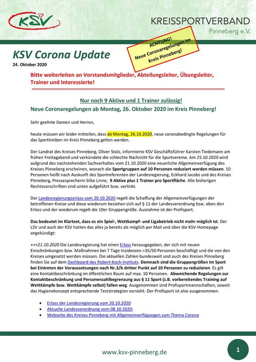 die Corona-Pandemie hat uns weiterhin voll im Griff und kommt derzeit leider mit steigenden Inzidenzzahlen zurück. Im Kreis Pinneberg ist der kritische Wert von 50 Neuinfektionen je 100.000 Einwohner erreicht, sodass in einer Allgemeinverfügung des Kreises auch massive Einschränkungen für den Sport angekündigt sind.