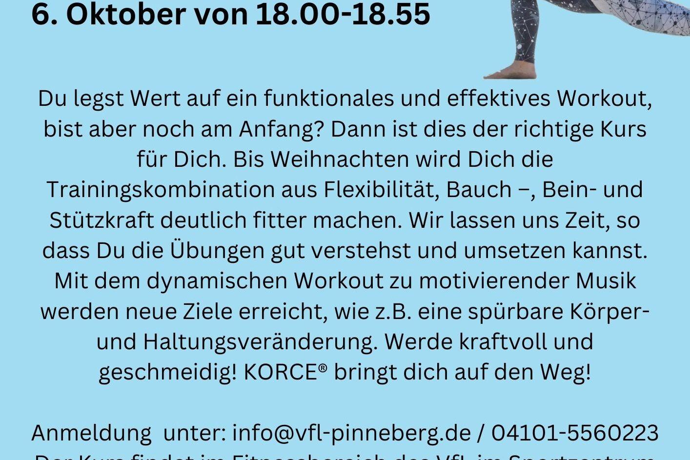 Du legst Wert auf ein funktionales und effektives Workout, bist aber noch am Anfang? Dann ist dies der richtige Kurs für Dich. Bis Weihnachten wird Dich die Trainingskombination aus Flexibilität, Bauch –, Bein- und Stützkraft deutlich fitter machen. Wir lassen uns Zeit, so dass Du die Übungen gut verstehst und umsetzen kannst. Mit dem dynamischen Workout zu motivierender Musik werden neue Ziele erreicht, wie z.B. eine spürbare Körper- und Haltungsveränderung. Werde kraftvoll und geschmeidig! KORCE® bringt dich auf den Weg!