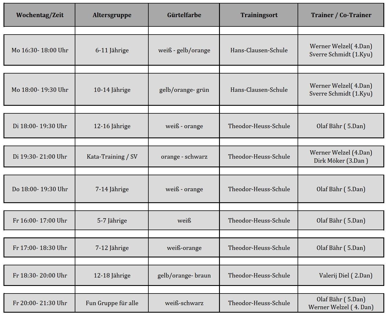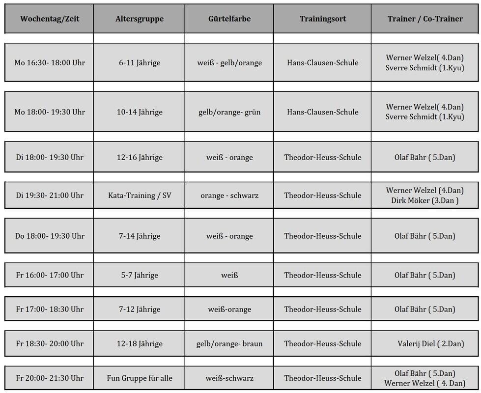 Bitte beachten Sie auch die unten stehende Legende zu den Trainingszeiten. Über die Suche können die Angebote gefiltert werden.